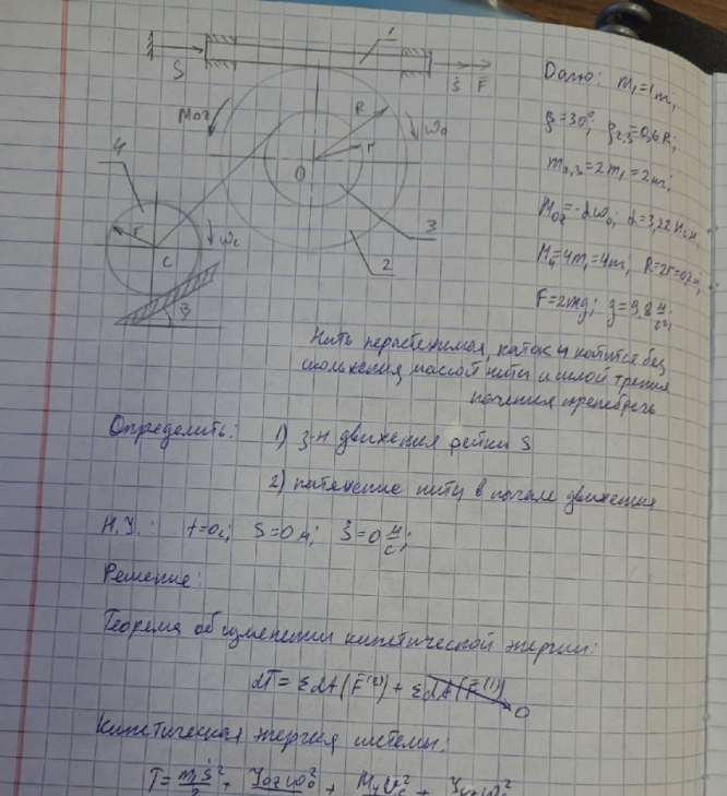 14. В механической системе рейка 1 массой m1 движется в горизонтальных гладких направляющих под действием постоянной силы F . Рейка находится в зацеплении с двухступенчатой шестернёй - барабаном радиуса R барабана 3 радиусом r. Радиус инерции шестерни - барабана 3 относительно их оси вращения равен ρ, m2 - их общая масса. К центру однородного катка 3 массой m3 прикреплена нерастяжимая нить, которая наматывается на барабан. Каток 3 катится без скольжения по неподвижной наклонной плоскости с углом наклона β. К шестерне 3 приложена пара сил с моментом MOZ = -αω2 (α = const > 0). Массой нити и трением качения пренебречь. В начальный момент система находилась в покое. Определить: 1) закон движения рейки 1; 2) натяжение нити в начале движения. В расчетах принять: m1 = 1 кг, m2 =2m1, m3 =4m1, F =2m1g, R = 2 r, ρ =0,6R, R = 0,2 м, β = 30°, α =3,22 Нс·м.