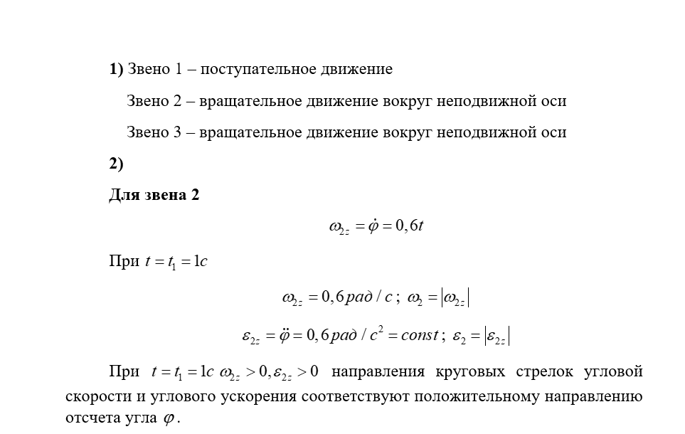 2) определить угловые скорости и угловые ускорения звеньев механизма, совершающих вращательное движение, указав на чертеже круговыми стрелками их направления, определить характер движения тел (замедленный или ускоренный);