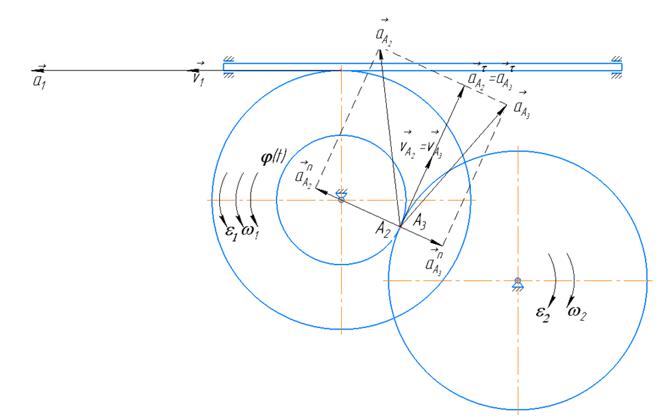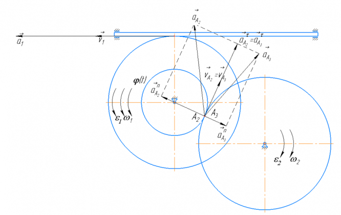 4) для точек контакта тел Ai (i - номер звена) определить скорости, ускорения и изобразить их на схеме механизма в соответствующем масштабе (см.разд. 4).