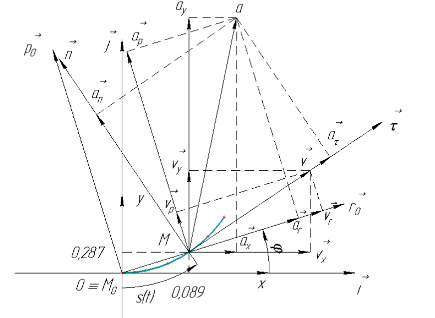 7) в выбранном масштабе выполнить чертеж с изображением траектории движения точки M. На чертеже указать все составляющие скорости и ускорения точки M в момент времени