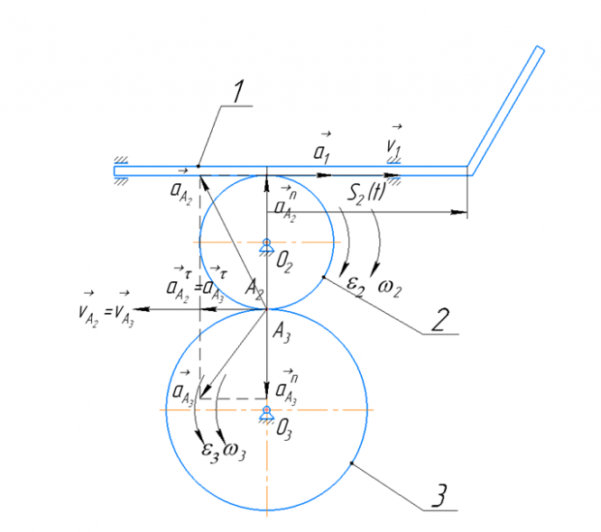 4) для точек контакта тел Ai (i - номер звена) определить скорости, ускорения и изобразить их на схеме механизма в соответствующем масштабе (см.разд. 4).