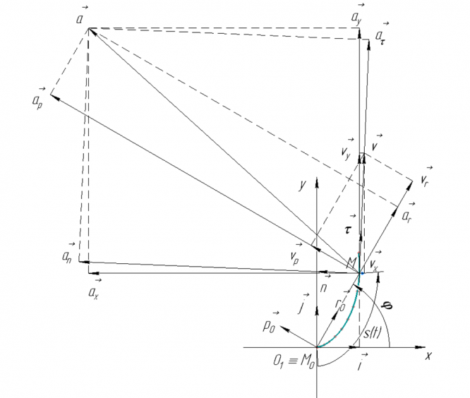 6) найти радиальные и трансверсальные составляющие скорости и ускорения точки M. Начало полярной системы координат нужно поместить в начало декартовой, направив полярную ось по оси Ox;