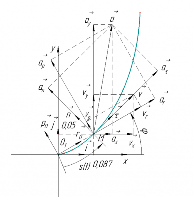 7) в выбранном масштабе выполнить чертеж с изображением траектории движения точки M. На чертеже указать все составляющие скорости и ускорения точки M в момент времени