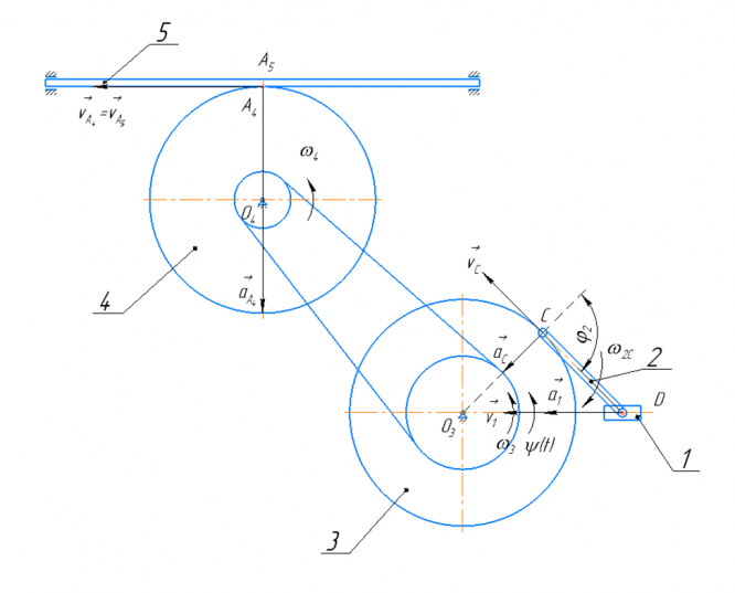4) для точек контакта тел Ai (i - номер звена) определить скорости, ускорения и изобразить их на схеме механизма в соответствующем масштабе (см.разд. 4).