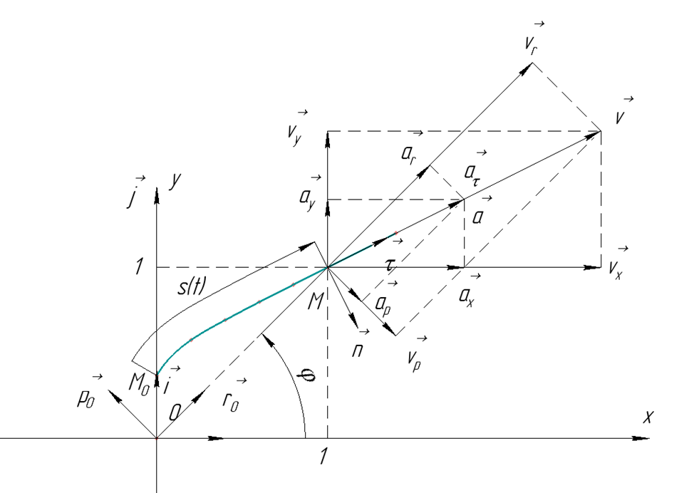 6) найти радиальные и трансверсальные составляющие скорости и ускорения точки M. Начало полярной системы координат нужно поместить в начало декартовой, направив полярную ось по оси Ox;