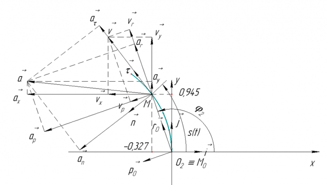 7) в выбранном масштабе выполнить чертеж с изображением траектории движения точки M. На чертеже указать все составляющие скорости и ускорения точки M в момент времени