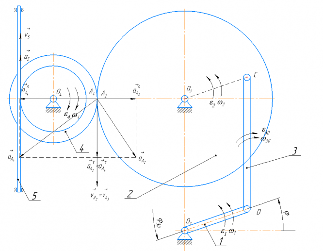 4) для точек контакта тел Ai (i - номер звена) определить скорости, ускорения и изобразить их на схеме механизма в соответствующем масштабе (см.разд. 4).