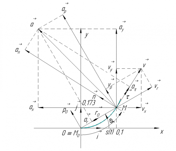 7) в выбранном масштабе выполнить чертеж с изображением траектории движения точки M. На чертеже указать все составляющие скорости и ускорения точки M в момент времени