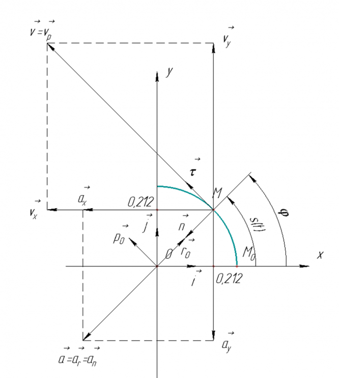 7) в выбранном масштабе выполнить чертеж с изображением траектории движения точки M. На чертеже указать все составляющие скорости и ускорения точки M в момент времени
