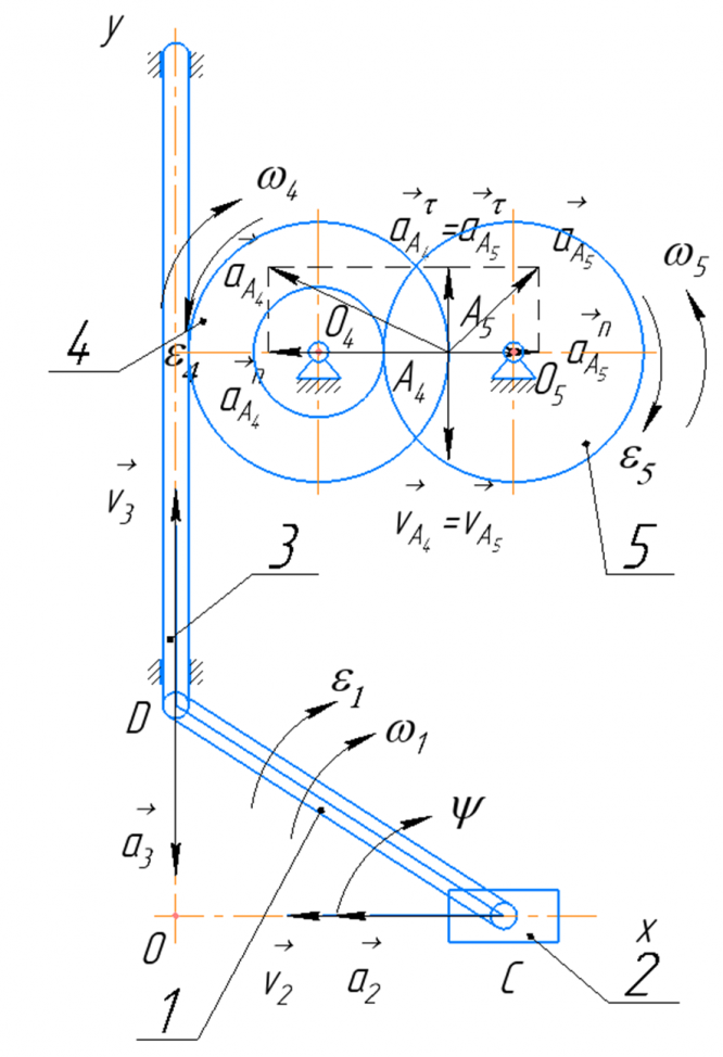 4) для точек контакта тел Ai (i - номер звена) определить скорости, ускорения и изобразить их на схеме механизма в соответствующем масштабе (см.разд. 4).