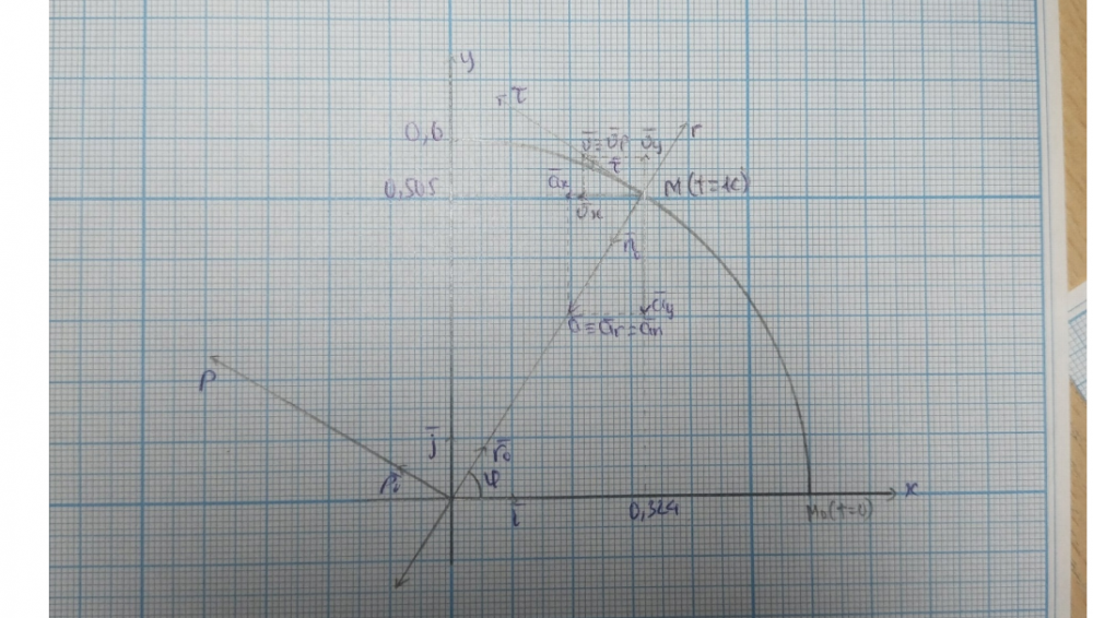 6) найти радиальные и трансверсальные составляющие скорости и ускорения точки M. Начало полярной системы координат нужно поместить в начало декартовой, направив полярную ось по оси Ox;