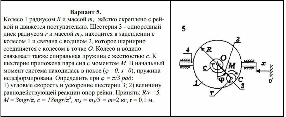 Вариант 5.Колесо 1 радиусом R и массой т1 жёстко скреплено с рейкой и движется поступательно. Шестерня 3 - однородный диск радиусом r и массой т3, находится в зацеплении с колесом 1 и связана с водилом 2, которое шарнирно соединяется с колесом в точке О. Колесо и водило связывает также спиральная пружина с жесткостью с. К шестерне приложена пара сил с моментом М. В начальный момент система находилась в покое (φ =0, х=0), пружина недеформирована. Определить при φ = π/3 рад: 1) угловые скорость и ускорение шестерни 3; 2) величину равнодействующей реакции опор рейки. Принять: R/r =5, М = Зтgr/π, с = 18тgr/π 2 , т3 = т1/5 = т=2 кг, r = 0,1 м.