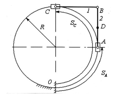 Два стержня 1 и 2 соединены междусобой шарниром В, а другие концыстержней связаны с ползунами шарнирами А и С. Ползуны перемещаются покруговой направляющей по законам