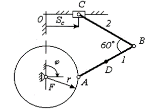 Звено 1 крепится с помощью шарнира А к ободу маховика, вращающегося по закону вокруг оси, проходящей через точку F . Звено 2 посредством шарнира С соединено с ползуном, движущимся по закону вдоль прямолинейной горизонтальной направляющей. Принять.