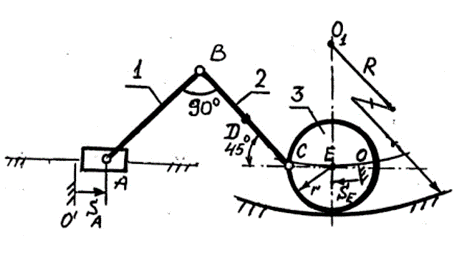 Ось катка 3 движется по закону Звено 2 механизма шарниром С связано с ободом катка 3 и шарниром В со звеном 1, соединенным шарниром А с ползуном. Движение ползуна происходит по закону Принять.