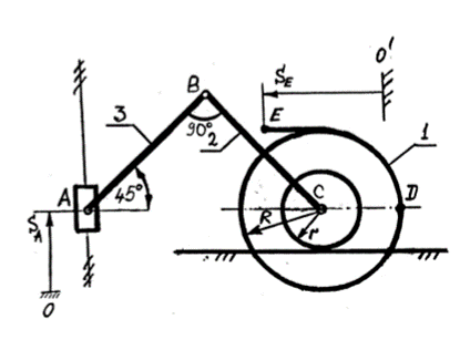 Звено 2 с помощью шарнира С связано с центром двухступенчатого катка и шарниром В со звеном 3. Каток 1 катится без скольжения по горизонтальной направляющей. На большую ступень катка намотан трос, конец которого Е движется горизонтально по закону