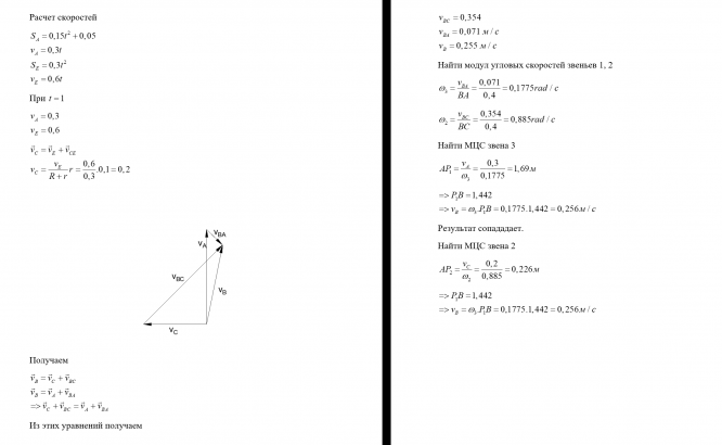 Кинематика плоского движения твёрдого тела Каждый вариант курсового задания содержит одну задачу. Рассматриваемая в задании   механическая система имеет две степени свободы. Для каждого варианта заданы законы   движения двух звеньев или одного звена и точки другого звена или нити. На схемах механизмов указаны начала и положительные направления отсчета величин, определяющих законы движения. Законы движения справедливы в пределах отрезка времени , который содержит и расчетный момент времени .Схемы механических систем изображены на рисунках для расчетного момента времени . Для момента времени требуется: 1) определить скорости и ускорения точек A, B,C, угловые скорости и ускорения всех звеньев механизмов; по векторным формулам построить многоугольники скоростей и ускорений точек; 2) найти положение мгновенного центра скоростей (МЦС) звеньев механизма и мгновенного центра ускорений (МЦУ) звена 2, с их помощью проверить правильность нахождения скорости и ускорения точки B ; 3) нанести на рисунок механизма векторы скоростей и ускорений точек A, B,C, обозначить круговыми стрелками направления угловых скоростей и ускорений звеньев  В механизме звено 3 шарниром А связано с ползуном, перемещающимся по закону Звено 2 с помощью шарнира С связано с центром двухступенчатого катка и шарниром В со звеном 3.