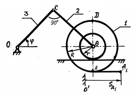 Кинематика плоского движения твёрдого тела Каждый вариант курсового задания содержит одну задачу. Рассматриваемая в задании   механическая система имеет две степени свободы. Для каждого варианта заданы законы   движения двух звеньев или одного звена и точки другого звена или нити. На схемах механизмов указаны начала и положительные направления отсчета величин, определяющих законы движения. Законы движения справедливы в пределах отрезка времени , который содержит и расчетный момент времени .Схемы механических систем изображены на рисунках для расчетного момента времени . Для момента времени требуется: 1) определить скорости и ускорения точек A, B,C, угловые скорости и ускорения всех звеньев механизмов; по векторным формулам построить многоугольники скоростей и ускорений точек; 2) найти положение мгновенного центра скоростей (МЦС) звеньев механизма и мгновенного центра ускорений (МЦУ) звена 2, с их помощью проверить правильность нахождения скорости и ускорения точки B ; 3) нанести на рисунок механизма векторы скоростей и ускорений точек A, B,C, обозначить круговыми стрелками направления угловых скоростей и ускорений звеньев  В механизме кривошип 3 вращается вокруг оси O(z) по закону Шатун 2 шарниром С связан с кривошипом 3, а шарниром В – с центром двухступенчатого катка.