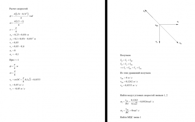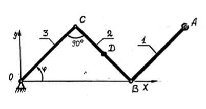 Кинематика плоского движения твёрдого тела Каждый вариант курсового задания содержит одну задачу. Рассматриваемая в задании   механическая система имеет две степени свободы. Для каждого варианта заданы законы   движения двух звеньев или одного звена и точки другого звена или нити. На схемах механизмов указаны начала и положительные направления отсчета величин, определяющих законы движения. Законы движения справедливы в пределах отрезка времени , который содержит и расчетный момент времени .Схемы механических систем изображены на рисунках для расчетного момента времени . Для момента времени требуется: 1) определить скорости и ускорения точек A, B,C, угловые скорости и ускорения всех звеньев механизмов; по векторным формулам построить многоугольники скоростей и ускорений точек; 2) найти положение мгновенного центра скоростей (МЦС) звеньев механизма и мгновенного центра ускорений (МЦУ) звена 2, с их помощью проверить правильность нахождения скорости и ускорения точки B ; 3) нанести на рисунок механизма векторы скоростей и ускорений точек A, B,C, обозначить круговыми стрелками направления угловых скоростей и ускорений звеньев  Кривошип 3 механизма робота, состоящего из звеньев 1, 2, 3, вращается вокруг оси O(z) по закону Точка А (схват робота) движется по Закону Принять.