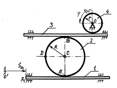 Рейка 3 находится в зацеплении с шестерней 4, которая вращается вокруг оси O(z) по закон Принять.