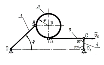 Кинематика плоского движения твёрдого тела Каждый вариант курсового задания содержит одну задачу. Рассматриваемая в задании механическая система имеет две степени свободы. Для каждого варианта заданы законы движения двух звеньев или одного звена и точки другого звена или нити. На схемах механизмов указаны начала и положительные направления отсчета величин, определяющих законы движения. Законы движения справедливы в пределах отрезка времени , который содержит и расчетный момент времени .Схемы механических систем изображены на рисунках для расчетного момента времени . Для момента времени требуется: 1) определить скорости и ускорения точек A, B,C, угловые скорости и ускорения всех звеньев механизмов; по векторным формулам построить многоугольники скоростей и ускорений точек; 2) найти положение мгновенного центра скоростей (МЦС) звеньев механизма и мгновенного центра ускорений (МЦУ) звена 2, с их помощью проверить правильность нахождения скорости и ускорения точки B ; 3) нанести на рисунок механизма векторы скоростей и ускорений точек A, B,C, обозначить круговыми стрелками направления угловых скоростей и ускорений звеньев В механизме кривошип 1 вращается вокруг неподвижной оси O(z) по закону Кривошип 1 шарнирно связан с диском 2, поводком 3 и кривошипом 4, который вращается вокруг оси O1(z) так, что скорость точки С постоянна по модулю Принять.