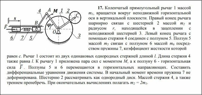17. Коленчатый прямоугольный рычаг 1 массой m1, вращается вокруг неподвижной горизонтальной оси в вертикальной плоскости. Правый конец рычага шарнирно связан с шестерней 2 массой m2 и радиусом r, находящейся в зацеплении с неподвижной шестерней 3. Левый конец рычага с помощью стержня 4 соединен с ползуном 5. Ползун 5 массой m5 связан с ползуном 6 массой m6 посредством пружины 7, коэффициент жесткости которой равен c. Рычаг 1 состоит из двух одинаковых однородных стержней длиной l. Длина стержня 4 также равна l. К рычагу 1 приложена пара сил с моментом M, а к ползуну 6 - горизонтальная сила F . Ползуны 5 и 6 перемещаются в горизонтальных направляющих. Составить дифференциальные уравнения движения системы. В начальный момент времени пружина 7 не деформирована. Шестерню 2 рассматривать как однородный диск. Массой стержня 4, а также трением пренебречь. При окончательных вычислениях полагать m2 = 2m1.