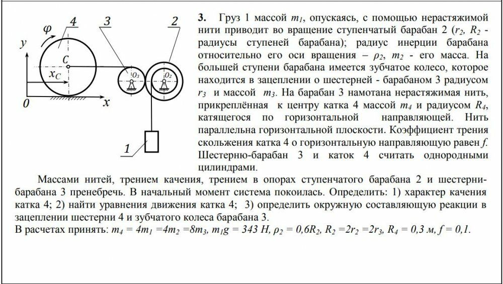 3. Груз 1 массой m1, опускаясь, с помощью нерастяжимой нити приводит во вращение ступенчатый барабан 2 (r2, R2 - радиусы ступеней барабана); радиус инерции барабана относительно его оси вращения – ρ2, m2 - его масса. На большей ступени барабана имеется зубчатое колесо, которое находится в зацеплении о шестерней - барабаном 3 радиусом r3 и массой m3. На барабан 3 намотана нерастяжимая нить, прикреплённая к центру катка 4 массой m4 и радиусом R4, катящегося по горизонтальной направляющей. Нить параллельна горизонтальной плоскости. Коэффициент трения скольжения катка 4 о горизонтальную направляющую равен f. Шестерню-барабан 3 и каток 4 считать однородными цилиндрами.Массами нитей, трением качения, трением в опорах ступенчатого барабана 2 и шестернибарабана 3 пренебречь. В начальный момент система покоилась. Определить: 1) характер качения катка 4; 2) найти уравнения движения катка 4; 3) определить окружную составляющую реакции в зацеплении шестерни 4 и зубчатого колеса барабана 3. В расчетах принять: m4 = 4m1 =4m2 =8m3, m1g = 343 Н, ρ2 = 0,6R2, R2 =2r2 =2r3, R4 = 0,3 м, f = 0,1