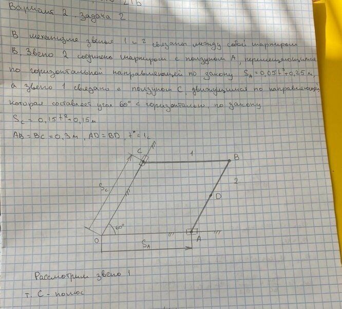 В механизме звенья 1 и 2 связаны между собой шарниром В. Звено 2 соединено шарниром с ползуном А, перемещающимся по горизонтальной направляющей по закону 0,05 0,25 3 SA t м, а звено 1 связано с ползуном С, движущимся по направляющей, которая составляет угол 600 с горизонталью, по закону 0,15 0,15 2 SC t м. Принять AB DC 0,3 м, AD BD,t 1с, 0 t 1 с.