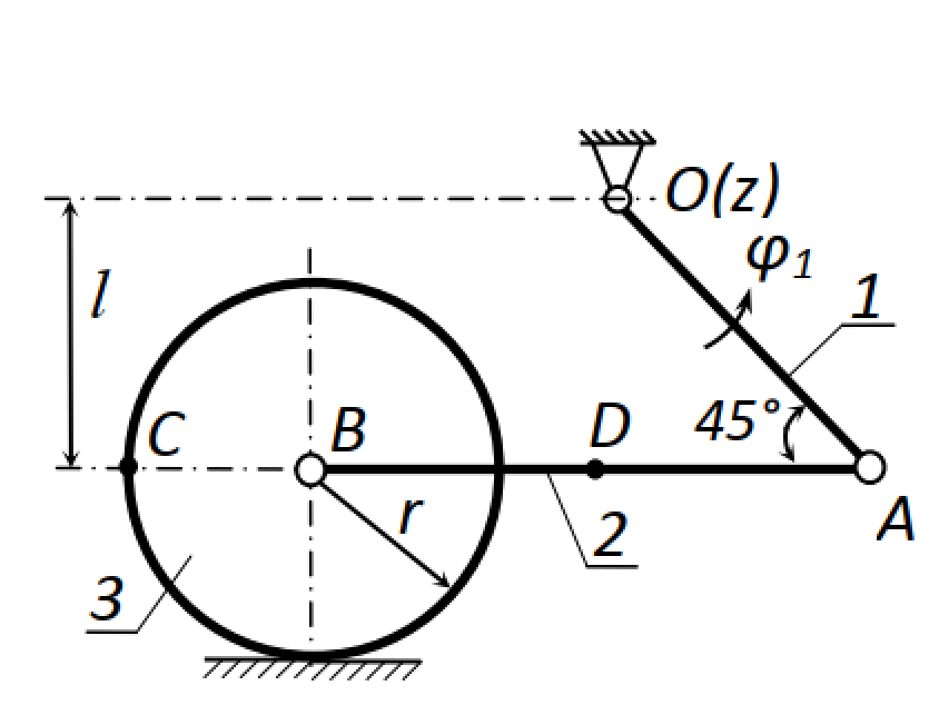 Вариант 17 Кинематика плоскогодвижения твёрдоготела – задачи с однойстепенью свободы В каждой из предлагаемых задач рассматривается плоский механизм, занимающий в данный момент времени t = 1 c положение, показанное на рисунке. Ответить на вопросы, поставленные в задачах, считая, что качение катков по основанию происходит без скольжения. No Схема Условие 17 Для данного положения механизма определить скорости и ускорения точек A, B, C и D, угловые скорости и ускорения звеньев 1, 2 и 3, если , АВ = 0,4 м, r = 0,15 м, l = 0,2 м. Скорости и ускорения точек звена 2 проверить с помощью МЦС и МЦУ. .