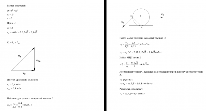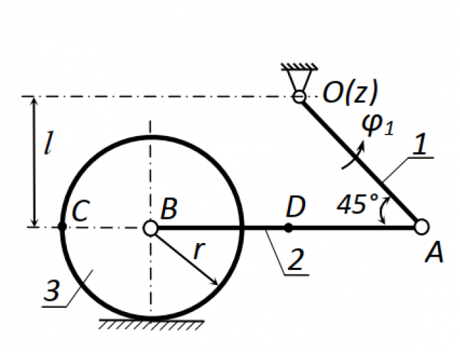 Вариант 17 Кинематика плоскогодвижения твёрдоготела – задачи с однойстепенью свободы В каждой из предлагаемых задач рассматривается плоский механизм, занимающий в данный момент времени t = 1 c положение, показанное на рисунке. Ответить на вопросы, поставленные в задачах, считая, что качение катков по основанию происходит без скольжения.   No Схема Условие 17 Для данного положения механизма определить скорости и ускорения точек A, B, C и D, угловые скорости и ускорения звеньев 1, 2 и 3, если , АВ = 0,4 м, r = 0,15 м, l = 0,2 м. Скорости и ускорения точек звена 2 проверить с помощью МЦС и МЦУ.  .
