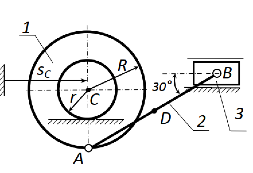 Вариант 19 Кинематика плоскогодвижения твёрдоготела – задачи с однойстепенью свободы В каждой из предлагаемых задач рассматривается плоский механизм, занимающий в данный момент времени t = 1 c положение, показанное на рисунке. Ответить на вопросы, поставленные в задачах, считая, что качение катков по основанию происходит без скольжения. No Схема Условие 19 Для данного положения механизма определить скорости и ускорения точек A, B, C и D, угловые скорости и ускорения звеньев 1 и 2, если sC = 7t –3t2 м, R = 0,4 м = 2r, АВ = 1,0 м, AD = BD . Скорости и ускорения точек звена 2 проверить с помощью МЦС и МЦУ.