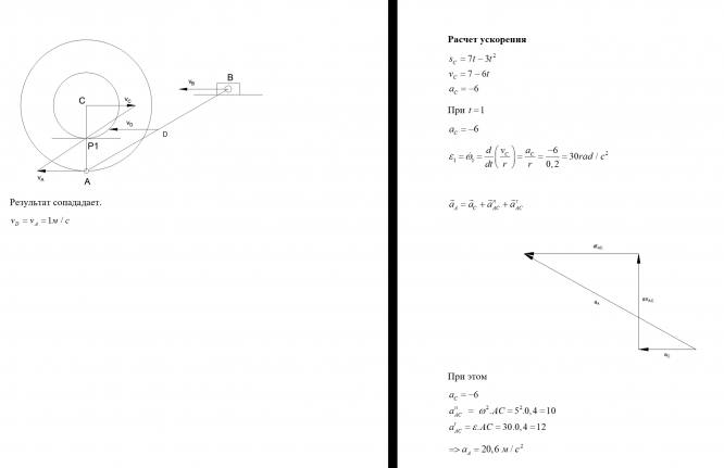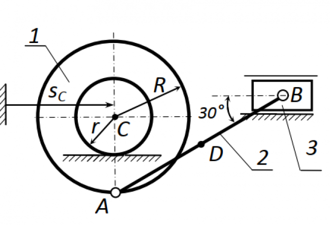 Вариант 19 Кинематика плоскогодвижения твёрдоготела – задачи с однойстепенью свободы В каждой из предлагаемых задач рассматривается плоский механизм, занимающий в данный момент времени t = 1 c положение, показанное на рисунке. Ответить на вопросы, поставленные в задачах, считая, что качение катков по основанию происходит без скольжения.   No Схема Условие 19 Для данного положения механизма определить скорости и ускорения точек A, B, C и D, угловые скорости и ускорения звеньев 1 и 2, если sC = 7t –3t2 м, R = 0,4 м = 2r, АВ = 1,0 м, AD = BD . Скорости и ускорения точек звена 2 проверить с помощью МЦС и МЦУ.