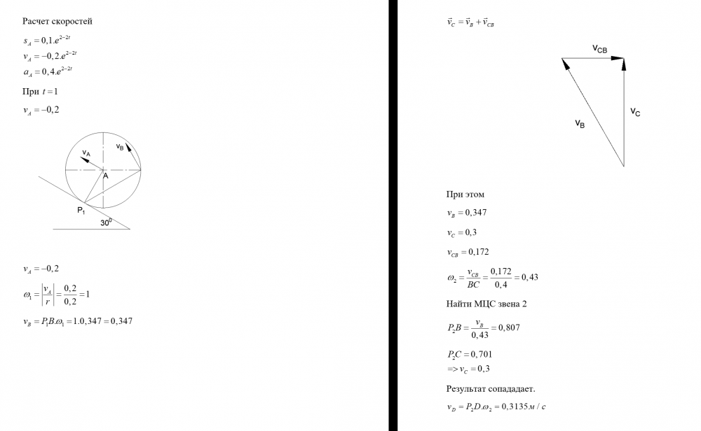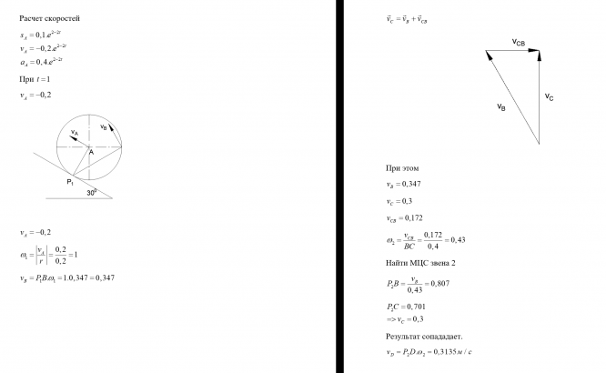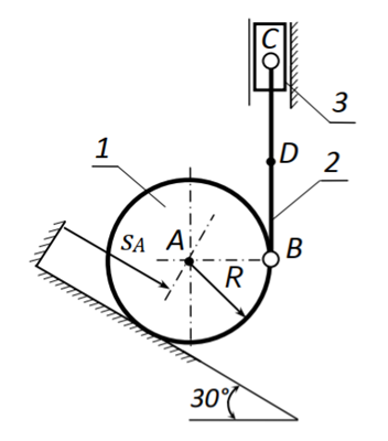 Вариант 22 Кинематика плоскогодвижения твёрдоготела – задачи с однойстепенью свободы В каждой из предлагаемых задач рассматривается плоский механизм, занимающий в данный момент времени t = 1 c положение, показанное на рисунке. Ответить на вопросы, поставленные в задачах, считая, что качение катков по основанию происходит без скольжения.   No Схема Условие 22 Для данного положения механизма определить скорости и ускорения точек A, B, C и D, угловые скорости и ускорения звеньев 1 и 2, если sA = 0,1e2-2t м, R = 0,2 м, ВC = 0,4 м,  CD = BD . Скорости и ускорения точек звена 2 проверить с помощью МЦС и МЦУ.