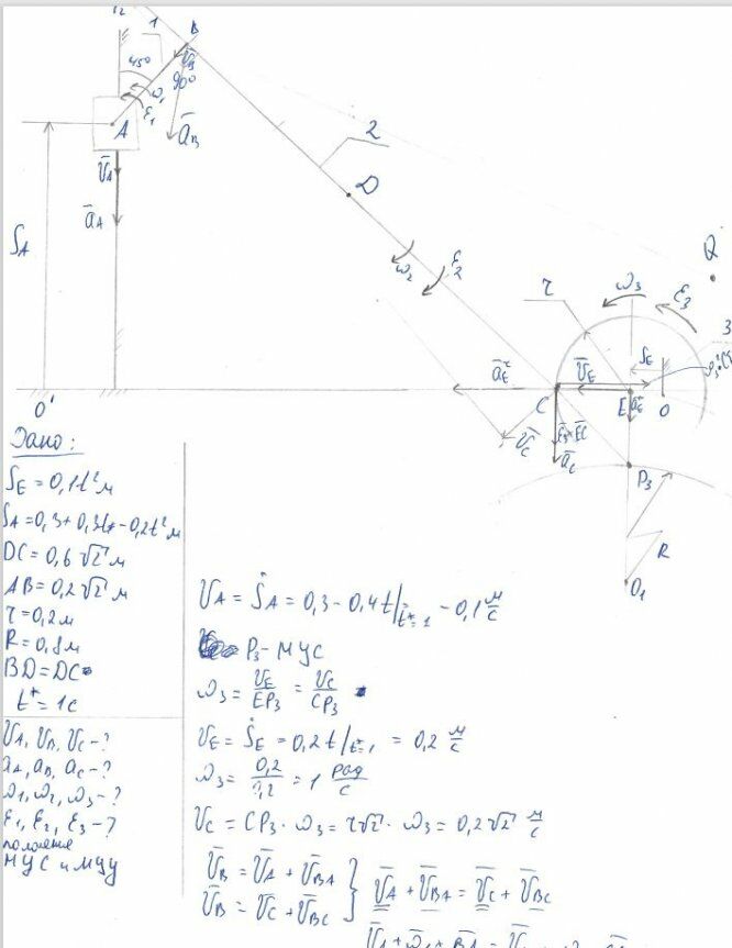 Кинематика плоского движения твердого тела. Защищено на 20 из 20 возможных балловДля момента времени t требуется: 1) определить скорости и ускорения точек A,B,C, угловые скорости и ускорения всех звеньев механизмов; по векторным формулам построить многоугольники скоростей и ускорений точек; 2) найти положение мгновенного центра скоростей (МЦС) звеньев механизма и мгновенного центра ускорений (МЦУ) звена 2, с их помощью проверить правильность нахождения скорости и ускорения точки B ; 3) нанести на рисунок механизма векторы скоростей и ускорений точек A,B,C, обозначить круговыми стрелками направления угловых скоростей и ускорений звеньев; 4) составить кинематические уравнения для расчета скорости и ускорения точки B , угловых скоростей и ускорений звеньев в зависимости от времени с помощью ЭВМ. Расчеты провести для 0 1 t t с помощью формул для плоского движения твердого тела, построить графические зависимости рассчитанных величин от времени, изобразить несколько положений механизма при движении, сопоставить расчеты,выполненные вручную, с расчетами на ЭВМ для ряда моментов времени В задачах нити нерастяжимы и не скользят по телам. В ряде задач указано, что тело вращается вокруг оси O(z) . Это значит, что тело вращается вокруг оси, перпендикулярной плоскости рисунка и проходящей через точку O ;