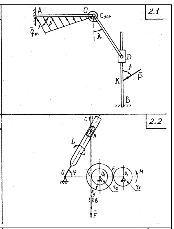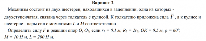 Механизм состоит из двух шестерен, находящихся в зацеплении, одна из которых - двухступенчатая, связана через толкатель с кулисой. К толкателю приложена сила F , а к кулисе и шестерне - пары сил с моментами L и М соответственно. Определить силу F и реакции опор O, O2, если r1 = 0,1 м, R2 = 2r2, ОК = 0,5 м, φ = 60°, М = 10 Н·м, L = 200 Н·м.