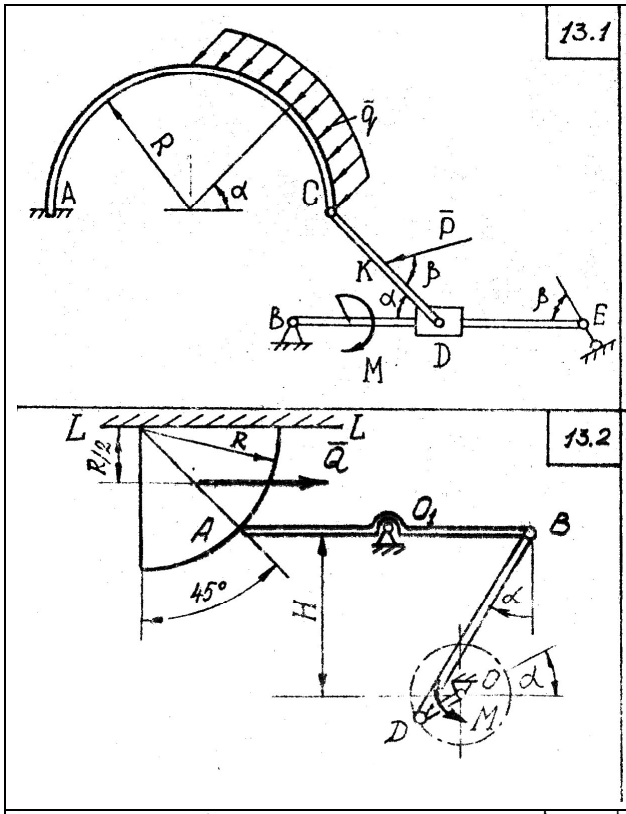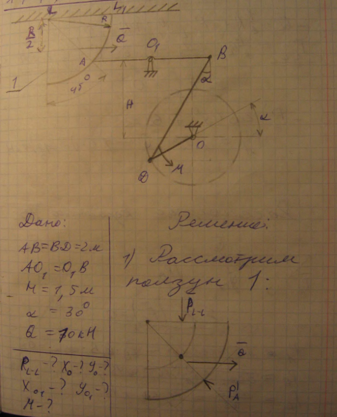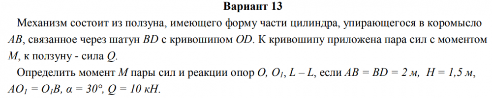 Механизм состоит из ползуна, имеющего форму части цилиндра, упирающегося в коромысло AB, связанное через шатун BD с кривошипом OD. К кривошипу приложена пара сил с моментом М, к ползуну - сила Q. Определить момент М пары сил и реакции опор O, O1, L – L, если AB = BD = 2 м, H = 1,5 м, AO1 = O1B, α = 30°, Q = 10 кН.