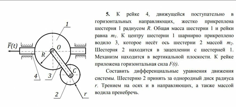 5. К рейке 4, движущейся поступательно в горизонтальных направляющих, жестко прикреплена шестерня 1 радиусом R. Общая масса шестерни 1 и рейки равна m1. К центру шестерни 1 шарнирно прикреплено водило 3, которое несёт ось шестерни 2 массой m2. Шестерня 2 находится в зацеплении с шестерней 1. Механизм находится в вертикальной плоскости. К рейке приложена горизонтальная сила F(t). Составить дифференциальные уравнения движения системы. Шестерню 2 принять за однородный диск радиуса r. Трением на осях и в направляющих, а также массой водила пренебречь.