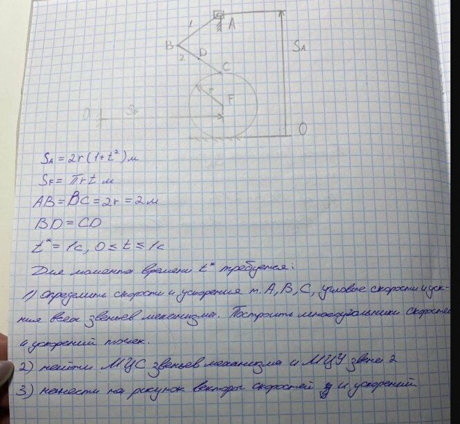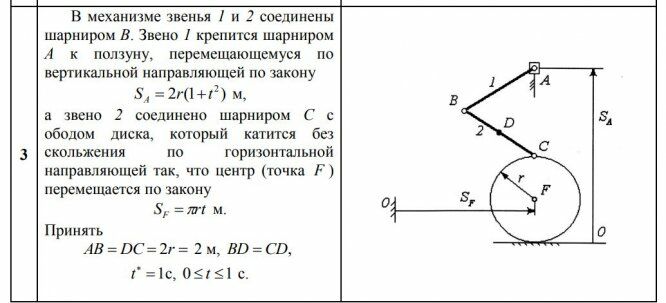 В механизме звенья 1 и 2 соединены шарниром В. Звено 1 крепится шарниром А к ползуну, перемещающемуся по вертикальной направляющей по закону 2 (1 ) 2 S r t A м, а звено 2 соединено шарниром С с ободом диска, который катится без скольжения по горизонтальной направляющей так, что центр (точка F ) перемещается по закону S rt F м. Принять AB DC 2r 2 м, BD CD, t 1с, 0 t 1 с.