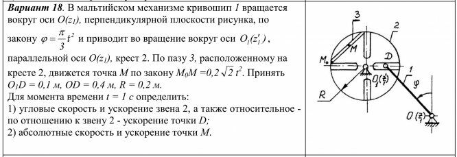 Вариант 18. В мальтийском механизме кривошип 1 вращается вокруг оси O(z1), перпендикулярной плоскости рисунка, по закону 2 3 t и приводит во вращение вокруг оси O (z ) 1 1 , параллельной оси O(z1), крест 2. По пазу 3, расположенному на кресте 2, движется точка М по закону M0M =0,2 2 t 2 . Принять O1D = 0,1 м, OD = 0,4 м, R = 0,2 м. Для момента времени t = 1 c определить: 1) угловые скорость и ускорение звена 2, а также относительное - по отношению к звену 2 - ускорение точки D; 2) абсолютные скорость и ускорение точки M.