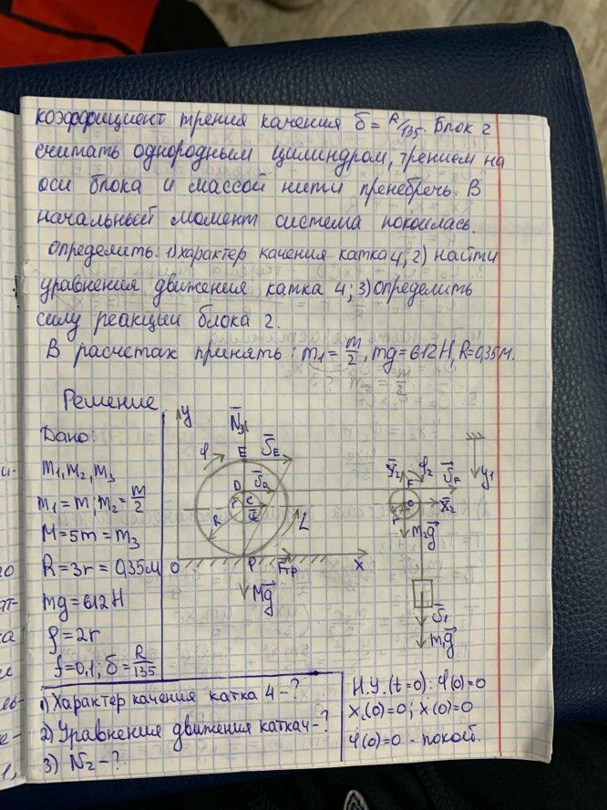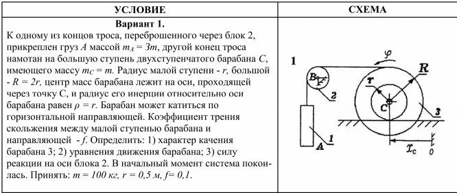 Вариант 1. К одному из концов троса, переброшенного через блок 2, прикреплен груз А массой тA = Зm, другой конец троса намотан на большую ступень двухступенчатого барабана С, имеющего массу тC = т. Радиус малой ступени - r, большой - R = 2r, центр масс барабана лежит на оси, проходящей через точку С, и радиус его инерции относительно оси барабана равен ρ = r. Барабан может катиться по горизонтальной направляющей. Коэффициент трения скольжения между малой ступенью барабана и направляющей - f. Определить: 1) характер качения барабана 3; 2) уравнения движения барабана; 3) силу реакции на оси блока 2. В начальный момент система покоилась. Принять: т = 100 кг, r = 0,5 м, f= 0,1.