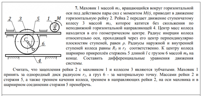 7. Маховик 1 массой m1, вращающийся вокруг горизонтальной оси под действием пары сил с моментом M(t), приводит в движение горизонтальную рейку 2. Рейка 2 передает движение ступенчатому колесу 3 массой m3, которое катится без скольжения по неподвижной горизонтальной направляющей 4. Центр масс колеса находится в его геометрическом центре. Радиус инерции колеса относительно оси, проходящей через его центр перпендикулярно плоскостям ступеней, равен ρ. Радиусы наружной и внутренней ступеней колеса равны R3 и r3 соответственно. К центру колеса шарнирно прикреплён стержень 5 длиной l с грузом 6 массой m6 на конце. Составить дифференциальные уравнения движения системы. Считать, что зацепления рейки 2 с маховиком 1 и колесом 3 являются зубчатыми.