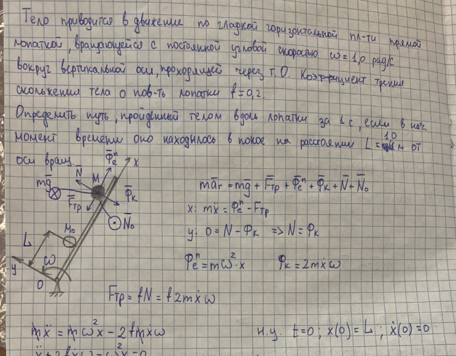 Тело приводится в движение по гладкой горизонтальной плоскости прямой лопаткой, вращающейся с постоянной угловой скоростью ω = 1,0 рад/с вокруг вертикальной оси, проходящей через точку О. Коэффициент трения скольжения тела о поверхность лопатки f = 0, Определить путь, пройденный телом вдоль лопатки за 1 с, если в начальный момент времени оно находилось в покое на расстоянии L = 1,0 м от оси вращения.