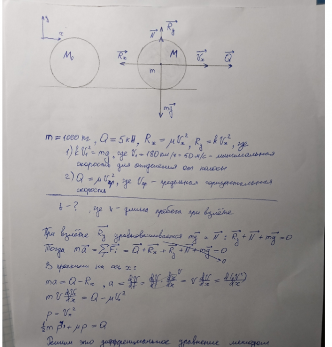 При взлете самолет массой т = 1000 кг разгоняется по взлетной полосе при постоянной тяге мотора Q = 5,0 кН. Проекции аэродинамической силы 2 Rx vx    , 2 y vx R  k  . Здесь μ и k - аэродинамические коэффициенты, определяемые из следующих условий: