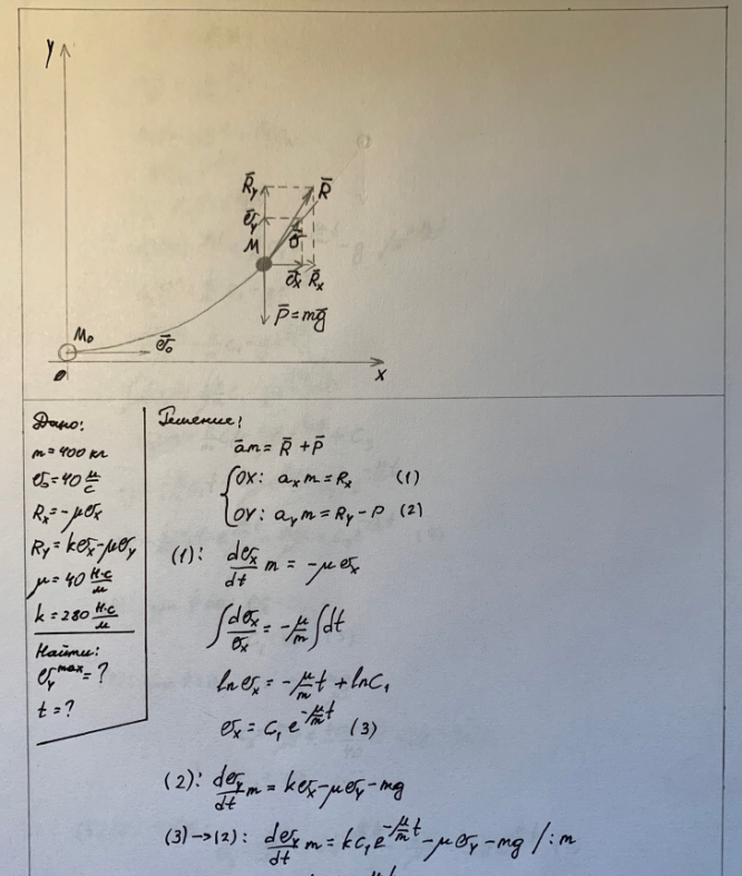 Планер массой т = 400,0 кг стартует с поверхности земли, имея начальную скорость v0 = 40,0 м/с, направленную по горизонтали. Аэродинамические силы, действующие на планер, приводятся к равнодействующей, проекции которой Rx = -μvx , Ry =kvx –μvy . Здесь vx , vy - проекции скорости планера, μ = 40,0 Н·с/м, k = 280,0 Н·с/м - аэродинамические коэффициенты.