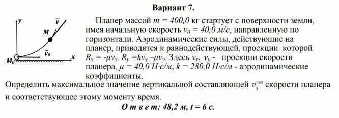 Планер массой т = 400,0 кг стартует с поверхности земли, имея начальную скорость v0 = 40,0 м/с, направленную по горизонтали. Аэродинамические силы, действующие на планер, приводятся к равнодействующей, проекции которой Rx = -μvx , Ry =kvx –μvy . Здесь vx , vy - проекции скорости планера, μ = 40,0 Н·с/м, k = 280,0 Н·с/м - аэродинамические коэффициенты.Определить максимальное значение вертикальной составляющей max y v скорости планера и соответствующее этому моменту время.