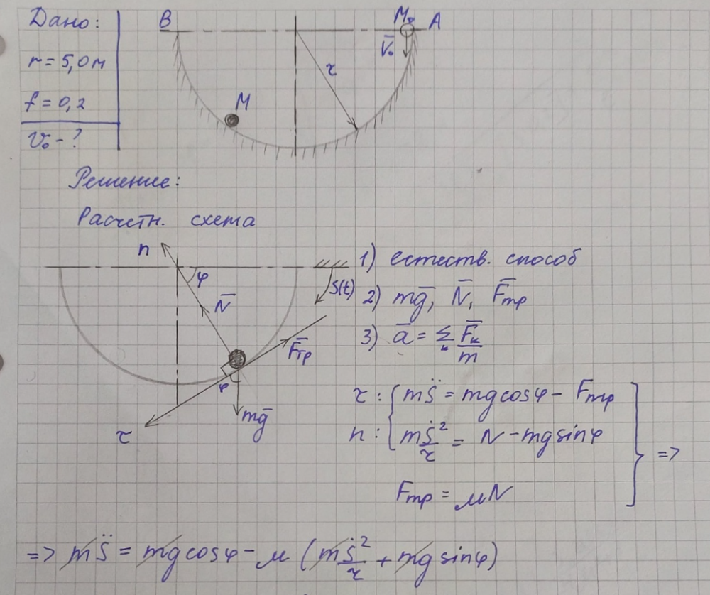 Тело движется в вертикальной плоскости по внутренней поверхности цилиндра радиусом r = 5,0 м. Коэффициент трения скольжения между телом и поверхностью f = 0,2. Определить, при каком значении начальной скорости 0 v тело, начавшее движение из положения A, достигнет кромки цилиндра.