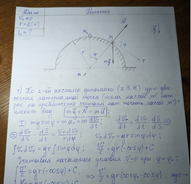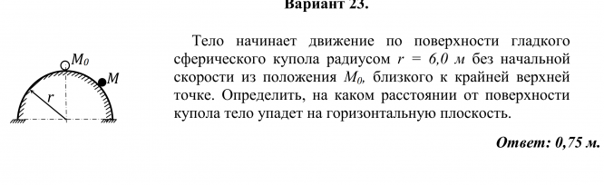 Тело начинает движение по поверхности гладкого сферического купола радиусом r = 6,0 м без начальной скорости из положения М0, близкого к крайней верхней точке. Определить, на каком расстоянии от поверхности купола тело упадет на горизонтальную плоскость.