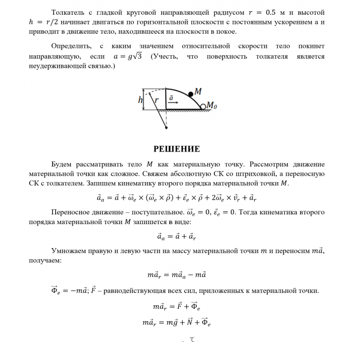 Толкатель с гладкой круговой направляющей радиусом r = 0,5 м и высотой h = r/2 начинает двигаться по горизонтальной плоскости с постоянным ускорением а и приводит в движение тело, находившееся на плоскости в покое