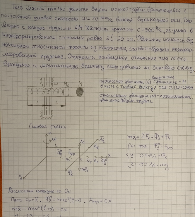 Тело массой m = 1,0 кг движется внутри гладкой трубки, вращающейся с постоянной угловой скоростью ω = 10,0 рад/с вокруг вертикальной оси. Тело связано с концом пружины АМ. Жесткость пружины с = 500,0 Н/м, её длина в недеформированном состоянии равна 2L = 20,0 см. Движение началось без начальной относительной скорости из положения, соответствующего недеформированной пружине.
