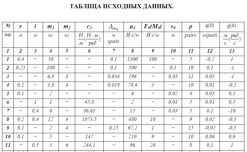 всех вариантов на схемах задана обобщенная координата q(t) , отсчитываемая от положения равновесия в невозмущенном состоянии, а в таблице - соответствующие ей начальные условия. На всех схемах номерами 1, 2 обозначены звенья, массу которых необходимо учитывать при составлении